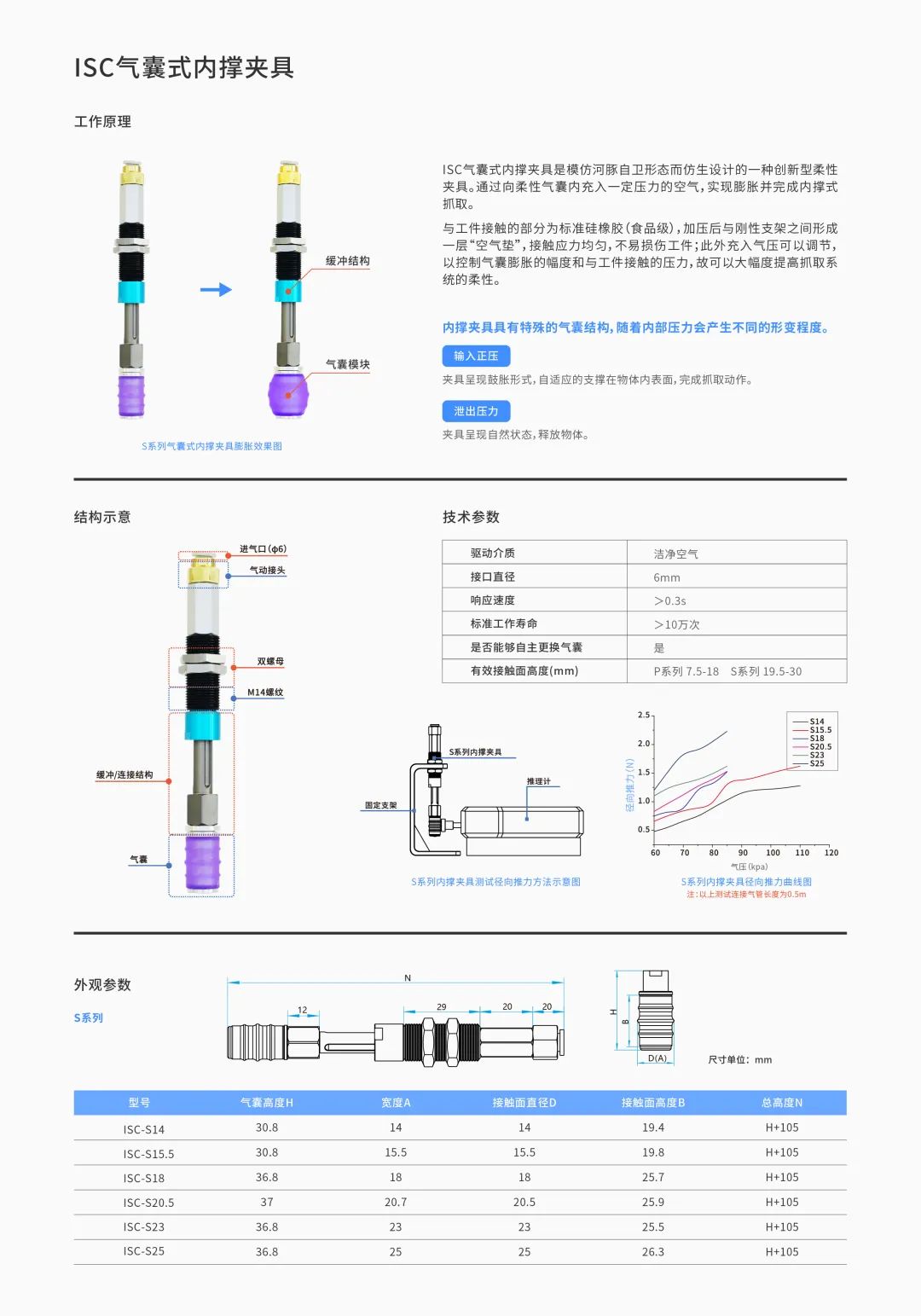 In the production environment of many varieties and small batch, ISC air bag internal support clamp has volume small, high flexibility and response speed of 0.3s, which can meet customer demands, especially it is suitable for the array grabbing of porous or circular materials in narrow space.