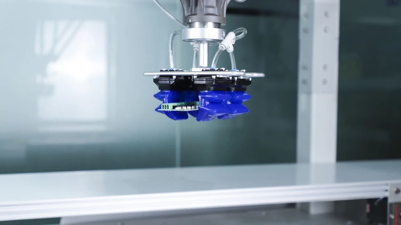 通過(guò)配置SRT的氣動(dòng)夾爪,在抓取物存在一定精度偏差的情況下也可實(shí)現(xiàn)準(zhǔn)確上料。方案中的氣動(dòng)夾爪的表面材質(zhì)柔軟,不會(huì)對(duì)電路板的外觀造成劃損。柔性?shī)A爪自身重量也較輕,在降低機(jī)械臂負(fù)重的同時(shí)節(jié)省生產(chǎn)線的場(chǎng)地空間。
