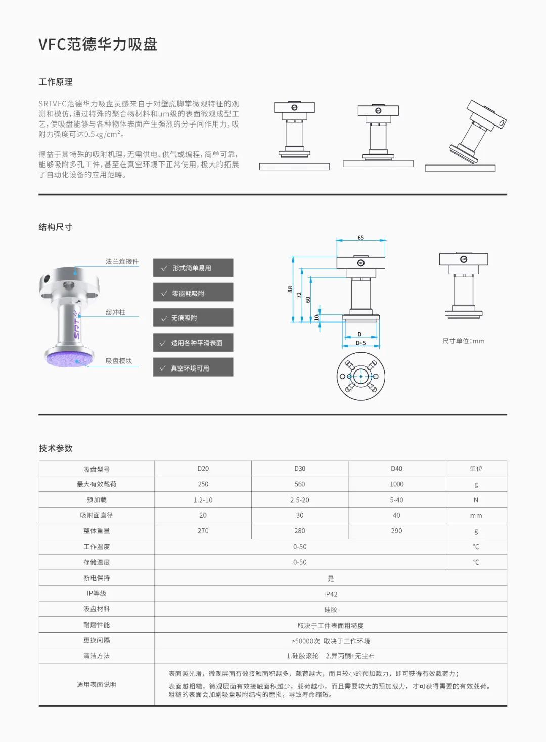 SRT通過對特殊的聚合物材料和μm級的表面工藝不斷研發(fā)創(chuàng)新,使吸盤與光滑物體表面產(chǎn)生強烈的分子間作用力,吸附力達0.5kg/cm2。聚合優(yōu)勢,推出全新產(chǎn)品——VFC系列范德華力吸盤。這款吸盤可牢牢吸附工件表面且無印記殘留,為處理如紙板、玻璃、電路板、金屬、塑料和光滑包裝等抓取難題帶來更多解決方案。