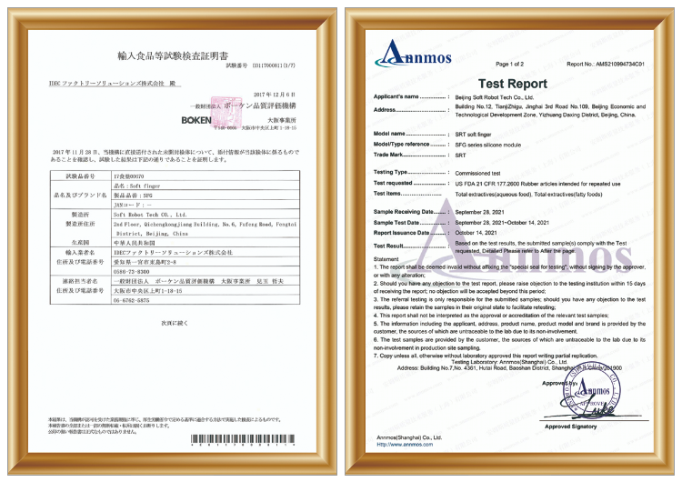 “2”認(rèn)證 —— 夾具手指為食品級硅膠制造,通過了美國FDA檢測、日本JFSL370雙向檢測認(rèn)證。