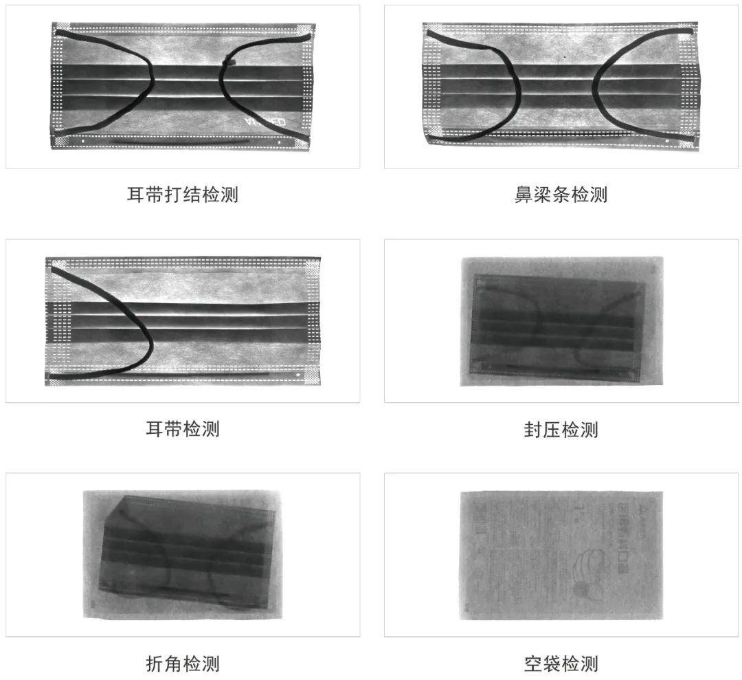口罩裸片檢測(cè)內(nèi)容:檢測(cè)口罩尺寸(精度±2mm)、有無(wú)耳帶、耳帶漏焊、耳帶打結(jié)、膠帶殘留、鼻梁條有無(wú)、口罩表面臟污和異物(可檢測(cè)頭發(fā)絲);