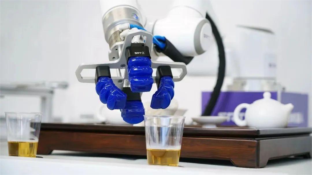 像人手一樣靈活的“藍色夾爪”輕輕地抓起茶壺蓋,又穩(wěn)穩(wěn)地拎起茶杯,注水、泡茶、倒茶,一整套動作如行云流水般流暢。近日,SRT軟體機器人接受了貝殼財經記者的采訪。
