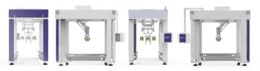 在物料抓取方面,移載機(jī)器人搭載多套不同結(jié)構(gòu)的抓手機(jī)構(gòu),并采用SRT自主研發(fā)的SFG柔性?shī)A爪執(zhí)行物品的抓取、裝盒、扣蓋、裝箱等作業(yè)。柔性?shī)A爪兼容性強(qiáng),可適應(yīng)多種物料種類及包裝材料規(guī)格;搭配快換裝置滿足了人工和自動(dòng)化等多種上下料需求。