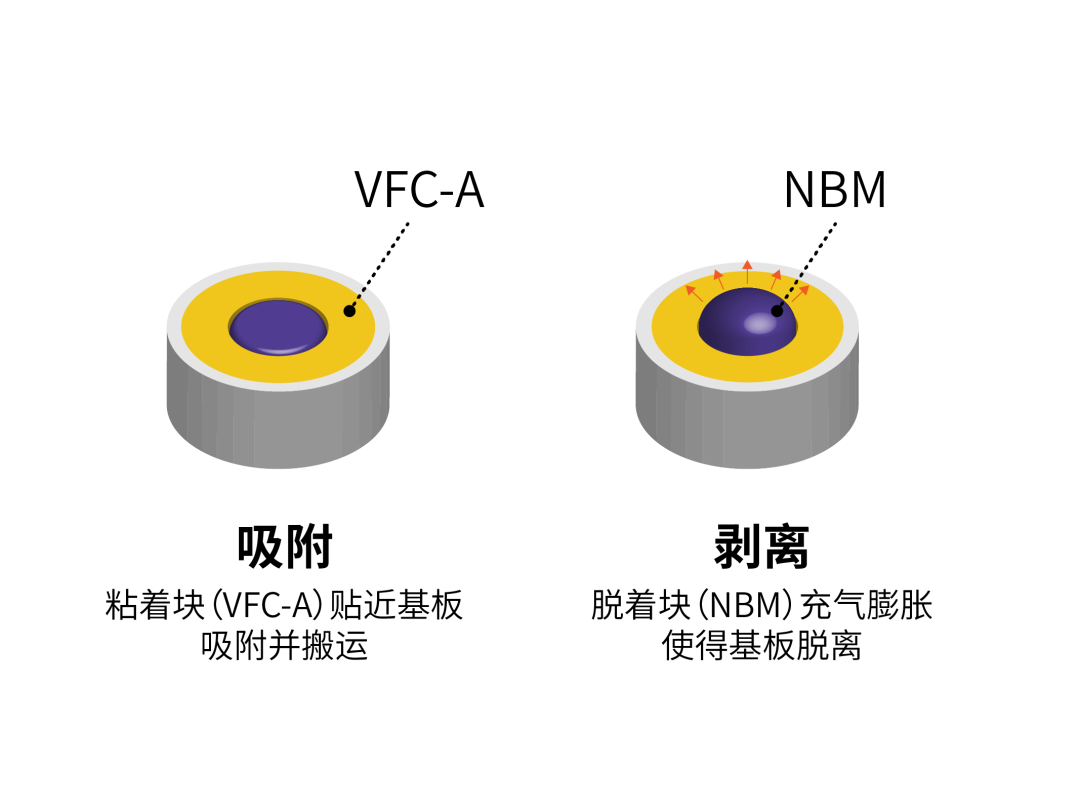 VFC-A使用原理:下料時(shí),將NBM脫著塊進(jìn)行充氣膨脹后,施力于玻璃基板,從而使基板從VFC粘著塊上剝離。