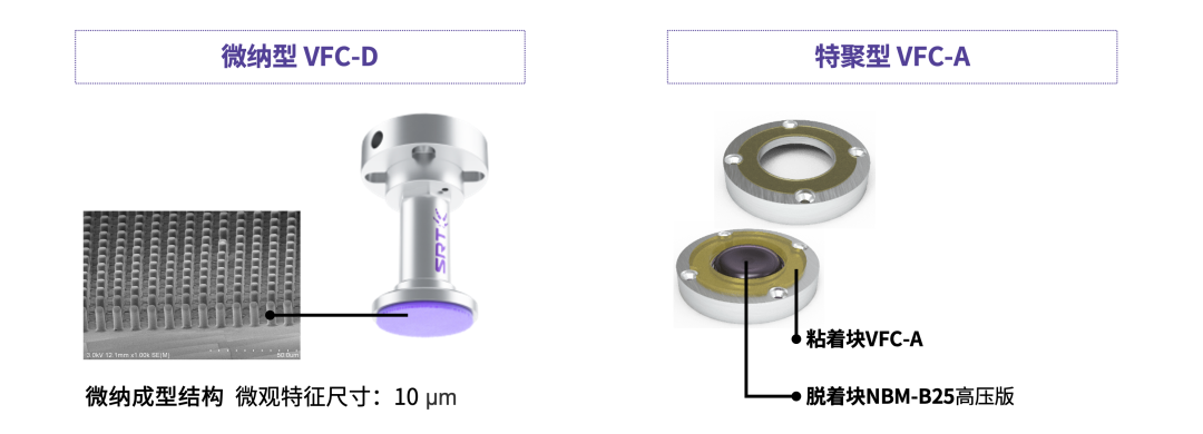 根據(jù)吸附特性,VFC范德華力吸盤主要有兩種類型,即微納型(VFC-D)和特聚型(VFC-A)。其中特聚型VFC-A范德華力吸盤的吸附力更大,在脫附時(shí)需要的脫附力就更大。
