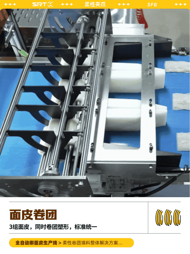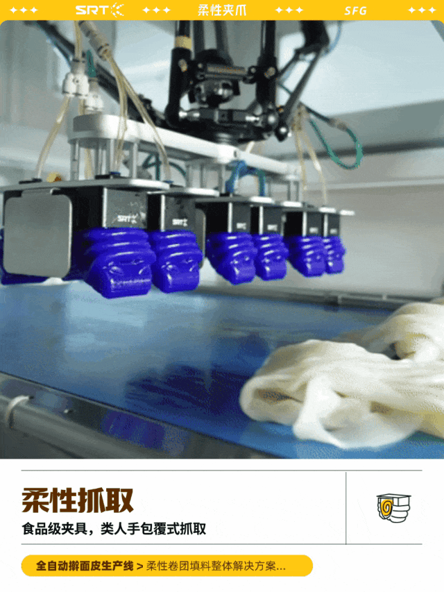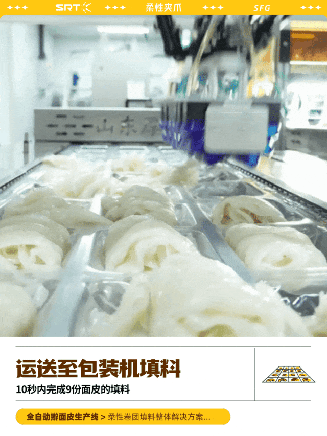 香氏元年是當(dāng)?shù)厥准乙胱詣踊瘶?biāo)準(zhǔn)化設(shè)備的搟面皮食品生產(chǎn)企業(yè)。SRT柔性卷團(tuán)填料整體解決方案通過柔性夾具與蜘蛛手機(jī)器人高效作業(yè),將被切割成條狀的面皮經(jīng)排盤設(shè)備有序排列并自動卷團(tuán),再使用柔性夾具將面皮放入包裝設(shè)備中,繼而流入下一道工序,完成面皮的卷團(tuán)、視覺識別、抓取填料流程,搭配輸送線精準(zhǔn)連接,重塑全場景作業(yè)流程。