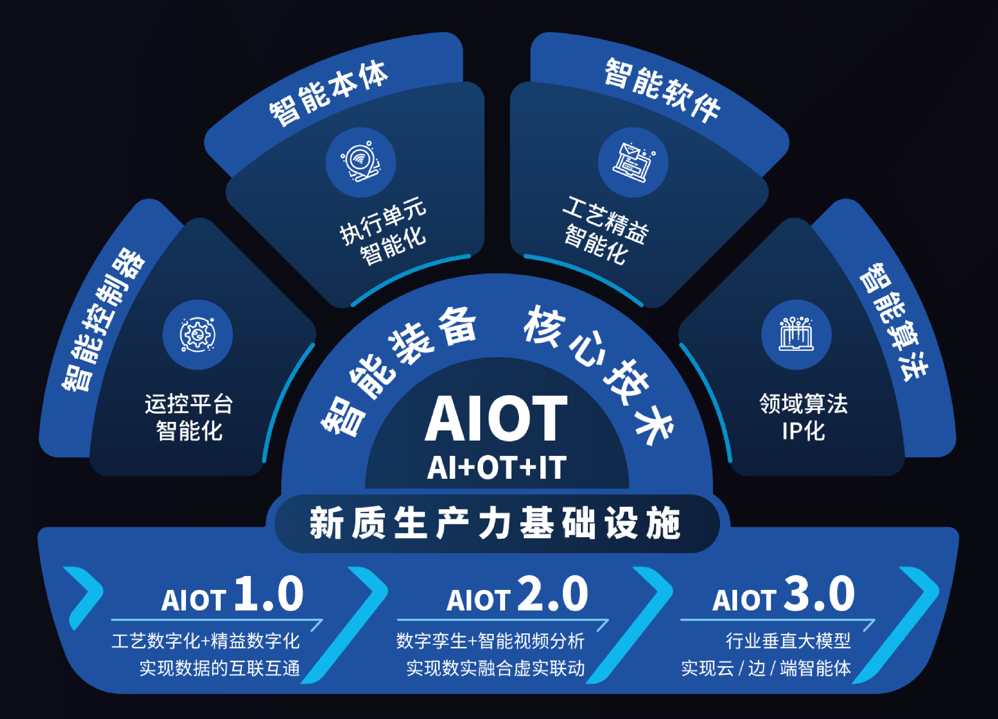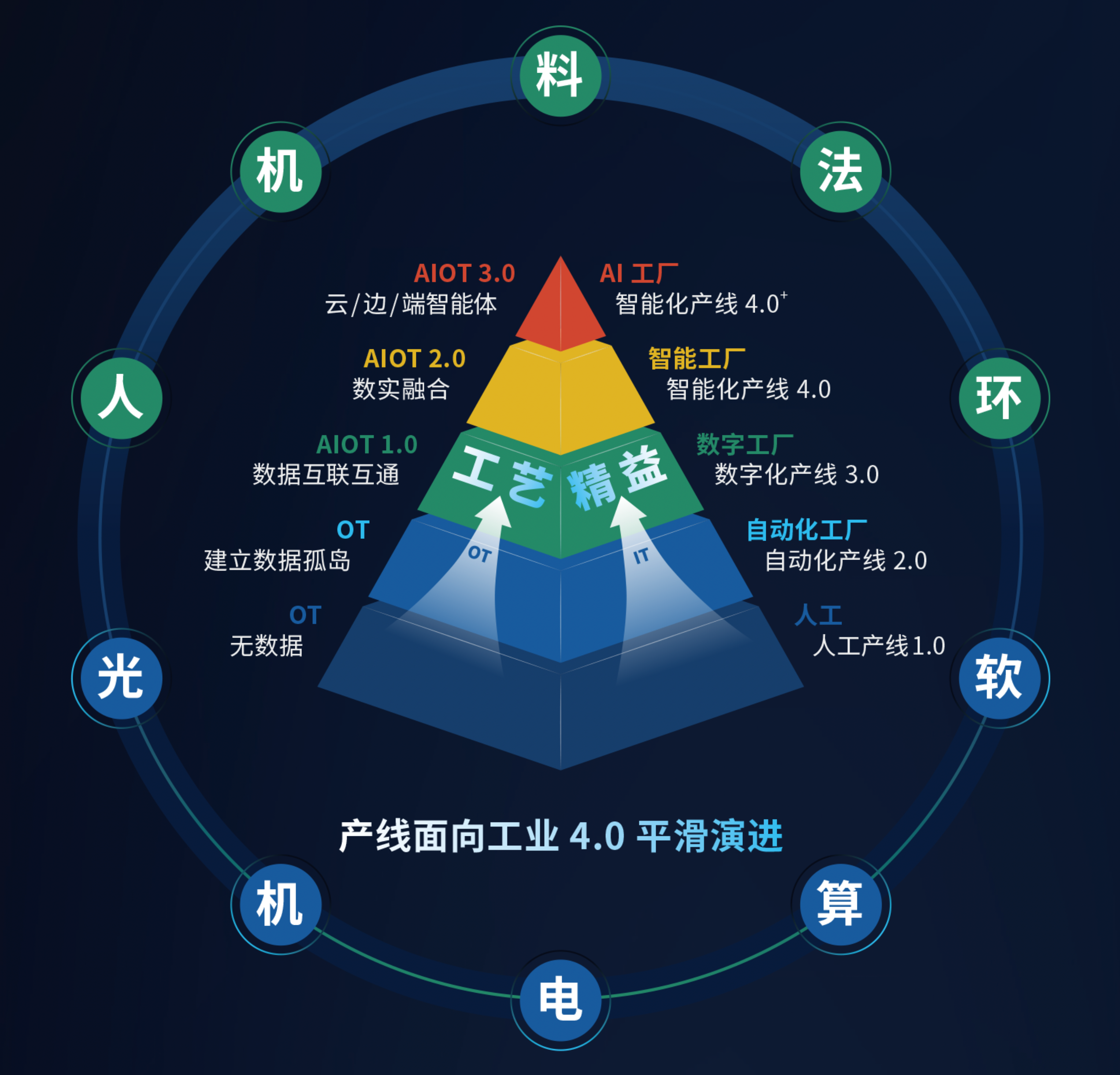 AI是人類“手、眼、腦”智慧能力的延伸,SRT在柔性智造領(lǐng)域圍繞智能執(zhí)行(機(jī)器人)、智能感知(視覺)和智能決策(BI)已具有豐碩的研發(fā)成果,保溫杯智能制造的核心技術(shù)是“光、機(jī)、電、算、軟、工藝+精益”,通過OT與IT的不斷融合推動生產(chǎn)力的進(jìn)步,實現(xiàn)制造業(yè)“人、機(jī)、料、法、環(huán)”生產(chǎn)要素之間關(guān)系的進(jìn)化重塑。博科視提出工業(yè)AI裝備的核心技術(shù)是AI+OT+IT,主要包括四個智能單元:智能本體、智能控制器、智能軟件與智能算法。