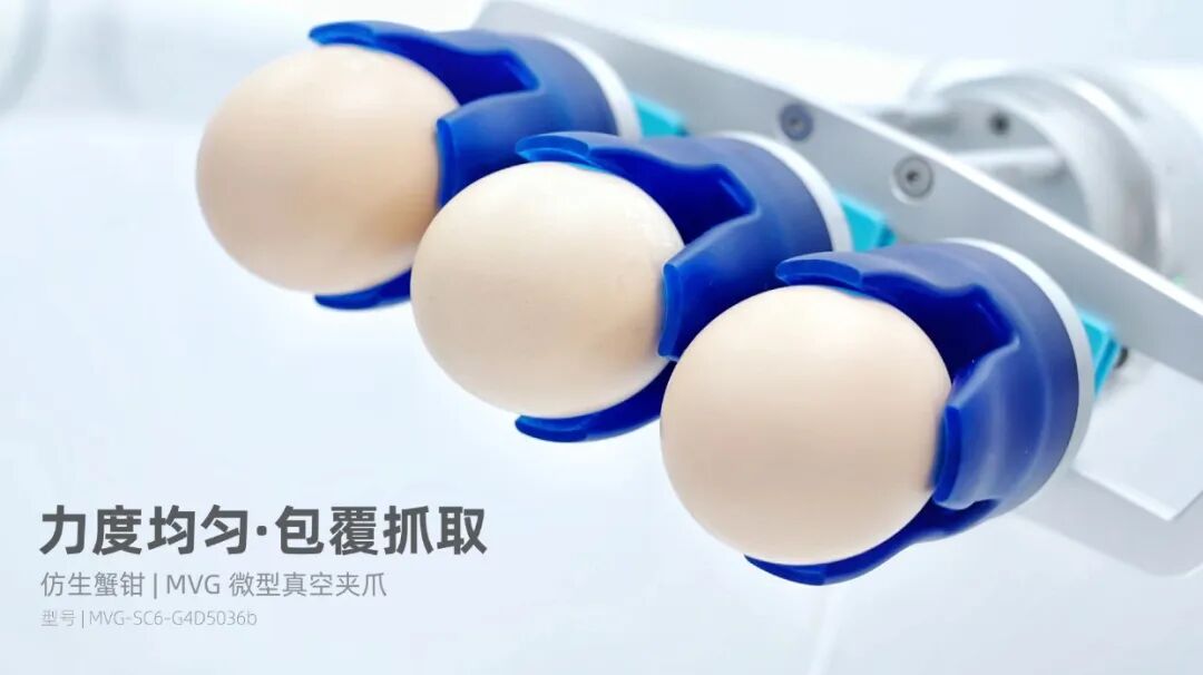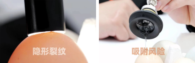蛋殼“隱形損傷”與衛(wèi)生風險是傳統(tǒng)方案的一對孿生問題。真空吸附的集中應(yīng)力會加劇蛋殼微裂紋,引發(fā)不可見的內(nèi)部損傷,推高損耗;其潛在的碎屑也加劇了吸盤管路堵塞與污染風險,導致維護頻繁。此外,面對44mm-73.5mm的禽蛋尺寸波動,真空吸盤自適應(yīng)能力欠佳,常需停機調(diào)整參數(shù),嚴重拖累了生產(chǎn)節(jié)拍與自動化產(chǎn)線的流暢性。